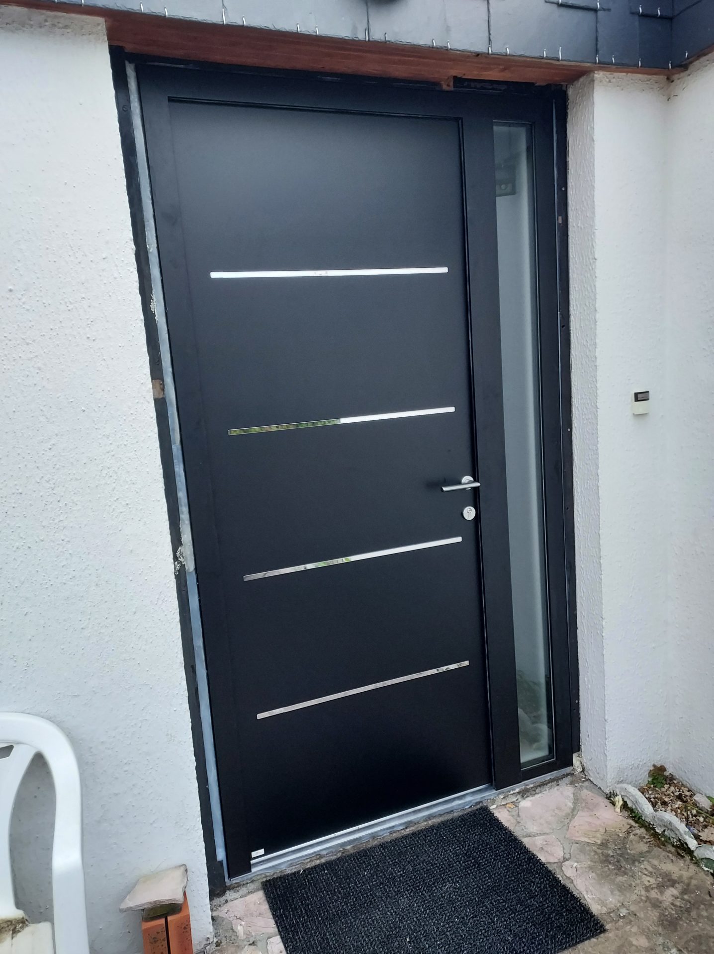 Pose d'une porte d'entrée avec partie tierce vitrée en aluminium gamme Allis