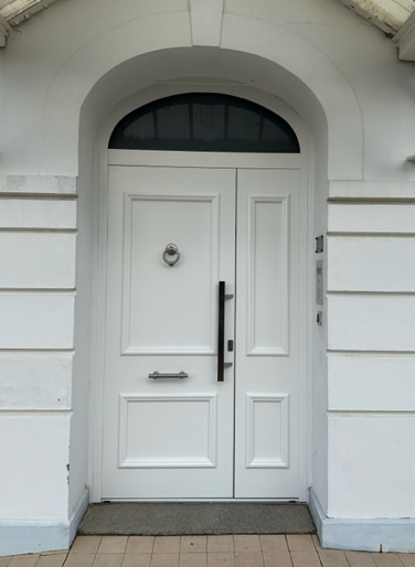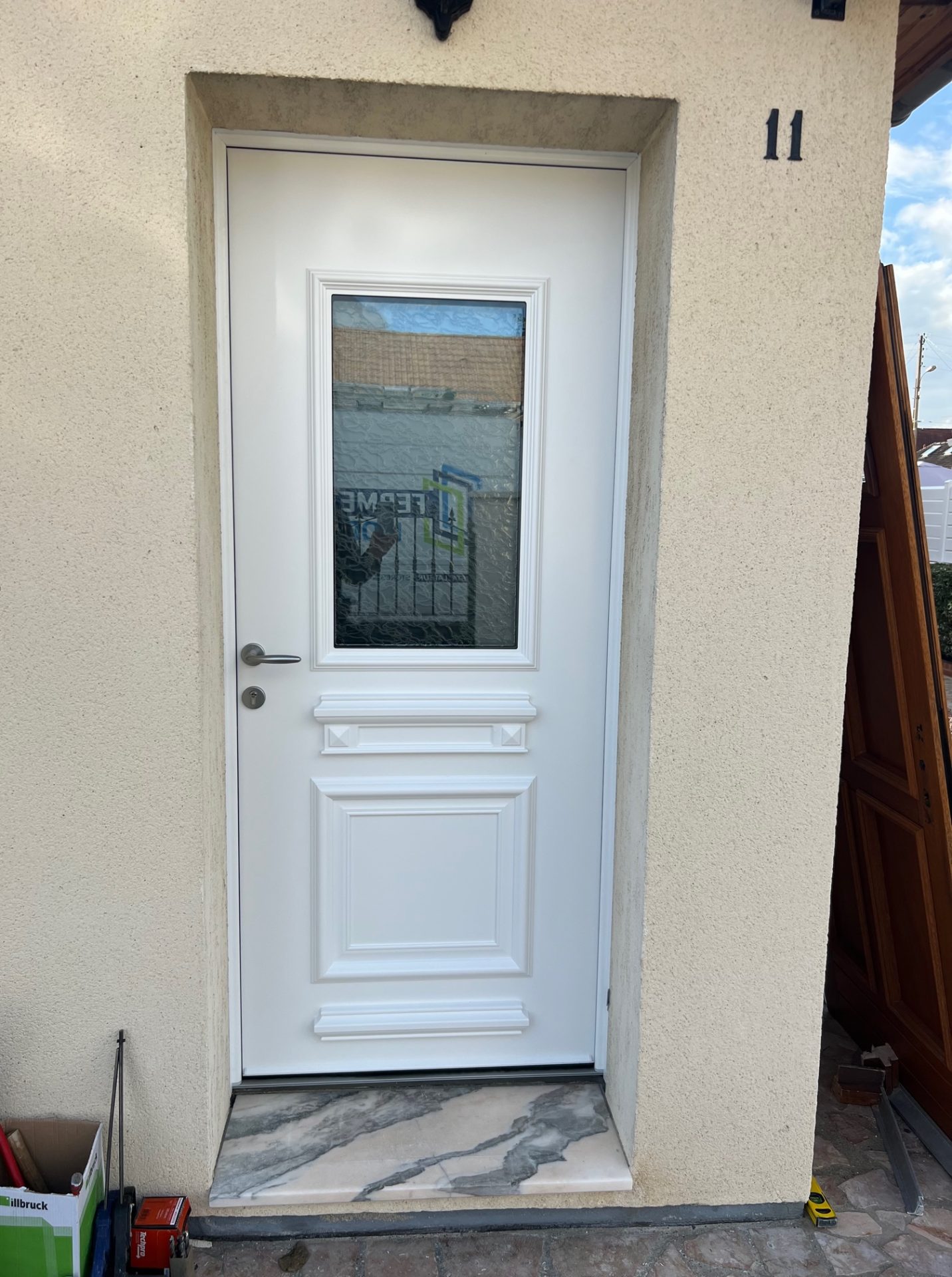 Pose d'une porte d'entrée en aluminium blanc avec imposte cintrée, bâton de maréchal, barre de tirage et heurtoir