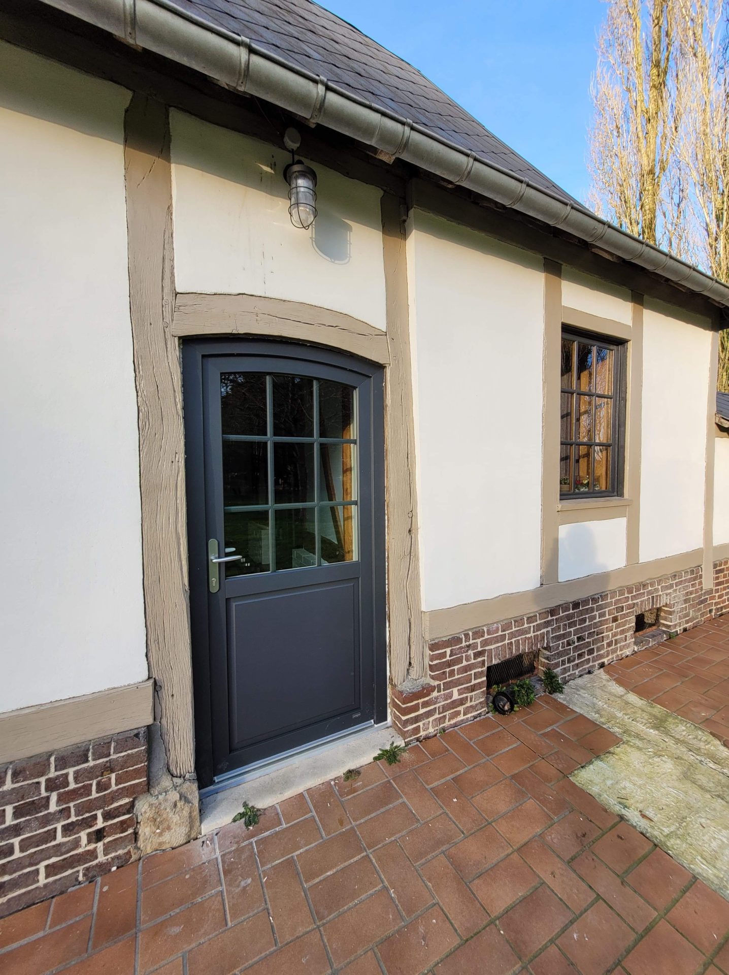 Pose d'une porte d'entrée cintrée en PVC gris anthracite, avec petits bois intégrés dans le vitrage